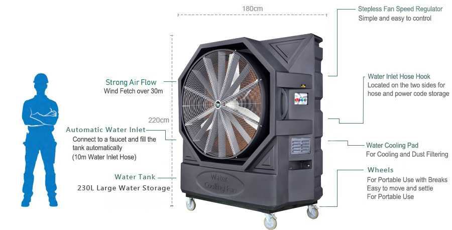Ya Suh Dar M502-COOL Verdunstungskühler ist ein mobiler, adiabatischer Luftkühler für den gewerblichen Einsatz. Dieses Gerät ist Teil der Ya Suh Dar-Serie und eignet sich besonders für die Kühlung von Innen- und Außenbereichen. Das Plug & Play-Gerät sorgt für angenehme Temperaturen in Fabriken, Industrie- und Produktionsbereichen, Restaurants oder Hotels. Geeignet für Flächen bis 500 m² mit einer Luftumwälzung von 48.000 m³ / Stunde. Ein adiabatischer Kühler kühlt nicht nur die Raumluft, sondern filtert auch Staub und Schmutz.